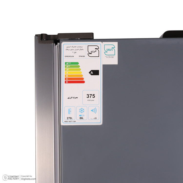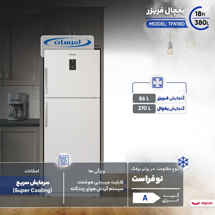 یخچال فریزر 18 فوت مدل «TFN18D» یکی از یخچالهای ساده، بهصرفه و کممصرف از سری یخچالهای بالاپایین شرکت امرسان (Emersun) است که به دلیل فضای مناسب داخل یخچال، یکی از پرطرفدارترین مدل یخچال و فریزرهای ایرانی است. شرکت صنایع امرسان یکی از پیشروهای صنعت در حفاظت از محیط زیست است از این سو امرسان در تولید محصولات لوازم خانگی ایرانی از تمام توان خود جهت تولید محصولات دوستدار محیط زیست استفاده میکند، از این رو گاز تبریدی و مواد مورد استفاده برای عایقبندی این محصول کاملا دوستدار محیط زیست هستند. گنجایش کلی این محصول 380 لیتر است که سهم یخچال 270 لیتر و سهم فریزر 86 لیتر است که فضای نسبتا کمی برای سردکردن و فریز کردن مواد غذایی محسوب میشود. از ویژگیهای این یخچال میتوان به سیستم کنترل دیجیتال مجهز به نمایشگر تاچ پنل، سیستم عیب یابی هوشمند، سیستم گردش هوای اجباری و سیستم انجماد سریع اشاره کرد.