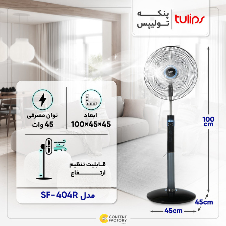 پنکه تولیپس مدل SF-404R در گروه پنکههای پایهدار و ایستاده عرضه شده است. این محصول ظاهری زیبا و کارآیی بالایی دارد. توان بالای موتور باعث راندمان کاری بالای دستگاه شده است. این پنکه قابلیت تنظیم ارتفاع دارد. حجم باددهی بالای دستگاه باعث میشود تا هوا در فضای بزرگی به جریان درآید. پنکه تولیپس مدل SF-404R از تایمر هم بهره میبرد. این مدل دارای گارد محافظ میلهای است تا از برخورد احتمالی با پرهها جلوگیری شود و خطری برای کسی ایجاد نشود. ریموت کنترل دستگاه امکانی بسیار مهم در این محصول است که باعث راحتی بیشتر کاربر میشود. طراحی دستگاه طوری است که ایستایی خوبی داشته و پایه طراحی شده برای آن مانع از افتادن در اثر برخورد یا تکانهای کوچک میشود. این دستگاه قابلیت تنظیم سرعت، قابلیت چرخش به سمت چپ و راست، را دارد. گفتنی است که پنکه تولیپس مدل SF-404R مجهز به نمایشگر دیجیتال هم است.