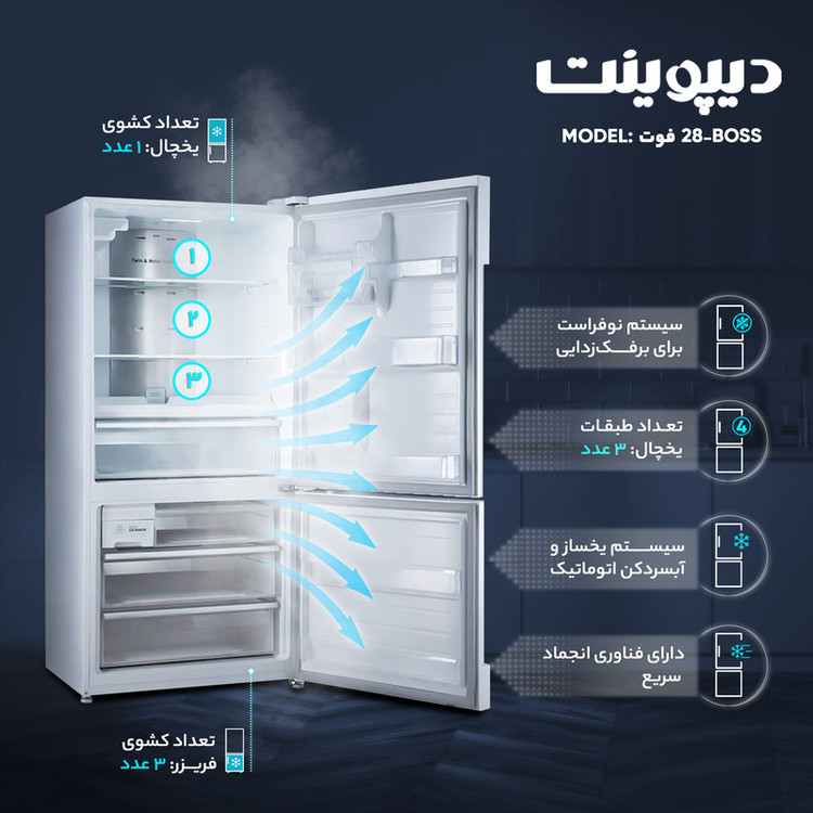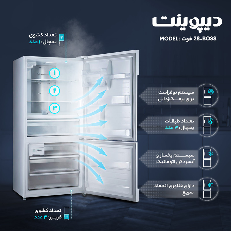 یخچال و فریزر 28 فوت دیپوینت مدل BOSS یکی از محصولات باکیفیت و پرطرفدار بازار است که با طراحی کاربردی و ویژگیهای مدرن خود، گزینهای ایدهآل برای خانوادههای پرجمعیت به شمار میآید. این مدل از نوع کمبی یا فریزر پایین (BMF) بوده و با ابعاد استاندارد شامل ارتفاع 190 سانتیمتر، پهنای 86 سانتیمتر و عمق 77 سانتیمتر بهراحتی در آشپزخانههای متوسط و بزرگ جای میگیرد. نمودار مصرف انرژی این دستگاه نشاندهنده بهرهوری بالا با گرید A است که به کاهش هزینههای برق کمک میکند. ظرفیت کلی دستگاه دیپوینت مدل BOSS 572 لیتر (معادل 28 فوت) بوده که 427 لیتر آن به یخچال و 145 لیتر به فریزر اختصاص داده شده که دارای سه طبقه داخلی و سه طبقه روی درب، به همراه یک کشو است و امکان دستهبندی و ذخیره مواد غذایی بهصورت منظم را فراهم میکند. فناوری نوفراست (بدون برفک) در این دستگاه از تشکیل یخ جلوگیری کرده و نیاز به تمیزکاری مداوم فریزر را از بین میبرد. فریزر هم شامل سه کشو و سه طبقه روی درب است و باقابلیت انجماد سریع، امکان حفظ کیفیت مواد غذایی را در کمترین زمان ممکن فراهم میکند. سیستم سرمایش دوگانه یخچال و فریزر 28 فوت دیپوینت مدل 28 فوت BOSS ، هوای سرد را بهصورت جداگانه در هر دو بخش مدیریت کرده و به حفظ طراوت مواد غذایی کمک میکند. سیستم گردش هوای داخلی هم با توزیع یکنواخت هوا، دمای مطلوب را در تمام نقاط دستگاه تضمین میکند. ویژگیهای دیگری نظیر آبسردکن با اتصال مستقیم به شیر آب، قفل کودک و فیلتر بوگیر، این مدل را به انتخابی مناسب برای خانوادههای امروزی تبدیل کرده است. همچنین صفحه سرمایش فلزی (Metal Cooling) به نگهداشت بهتر دما کمک کرده و عملکرد ECO مصرف بهینه انرژی را تضمین میکند.